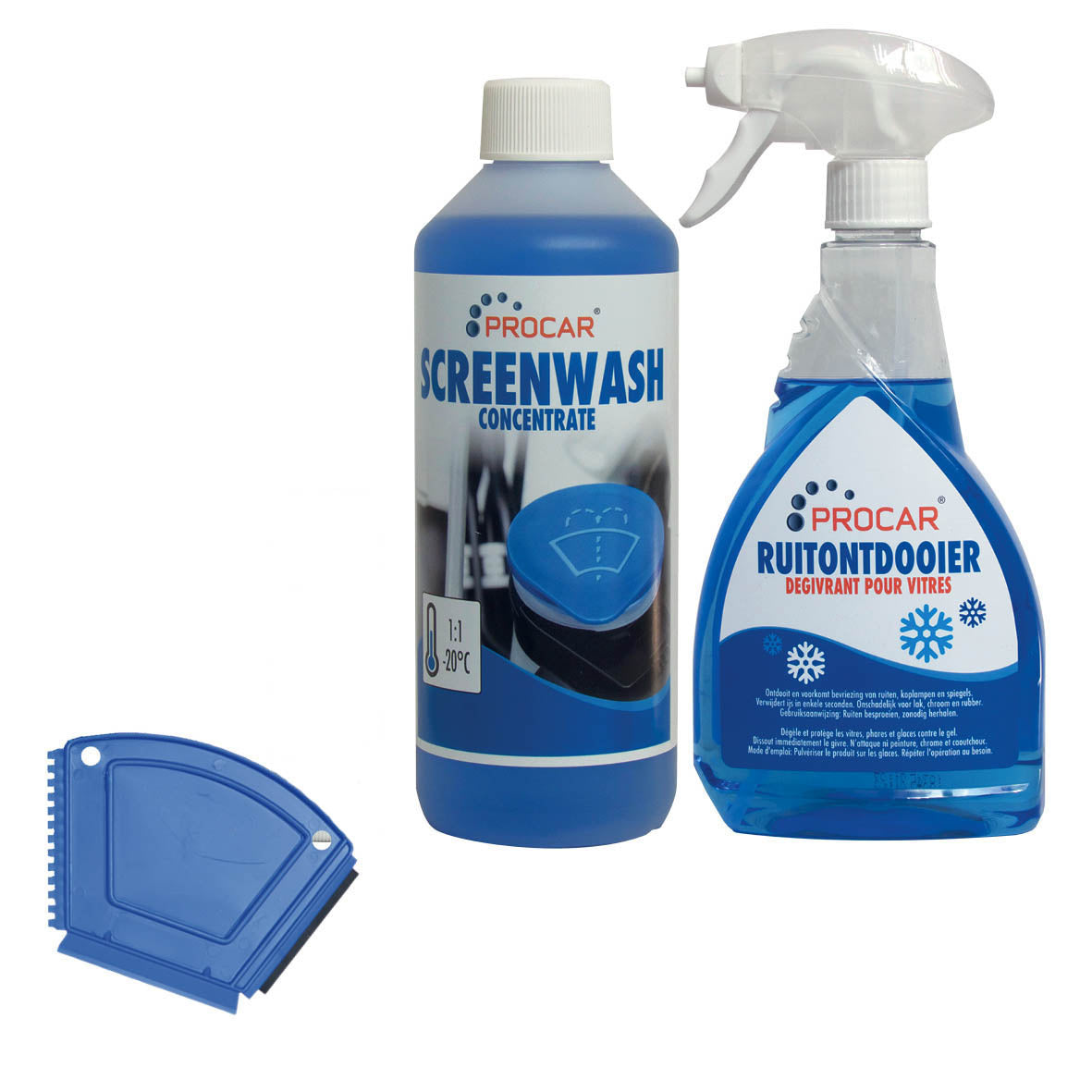 Procar 3-delige winterset bevat 500ml ruiten sproeier antivries concentraat, ruitontdooier en ijskrabber. De ruitontdooier heeft goede ontdooi prestaties en geschikt voor alle materialen. screenwash screen wash ruiten vloei