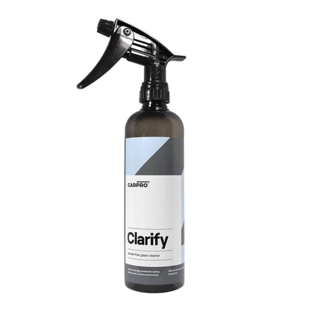 - Sprühen Sie 1-2 Sprühstöße Clarify auf ein CarPro Glassfiber Mikrofasertuch zur Glasreinigung.