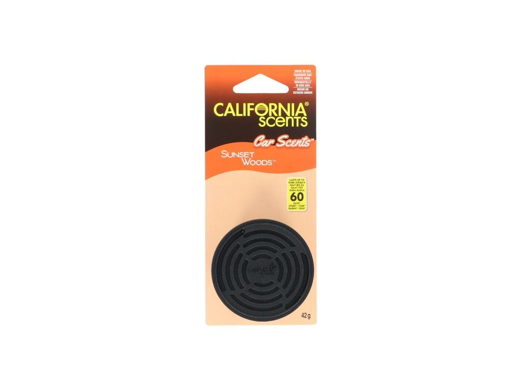 California Scents Air Freshener with Sunset Woods scent. Each tin contains three pillows filled with a 100% natural fragrance. The tin comes with a vented lid. Simply open the lid gradually to distribute the fragrance as desired. 100% organic and biodegradable. Provides fragrance for up to 60 days. Ideal for the car, home, office, etc.