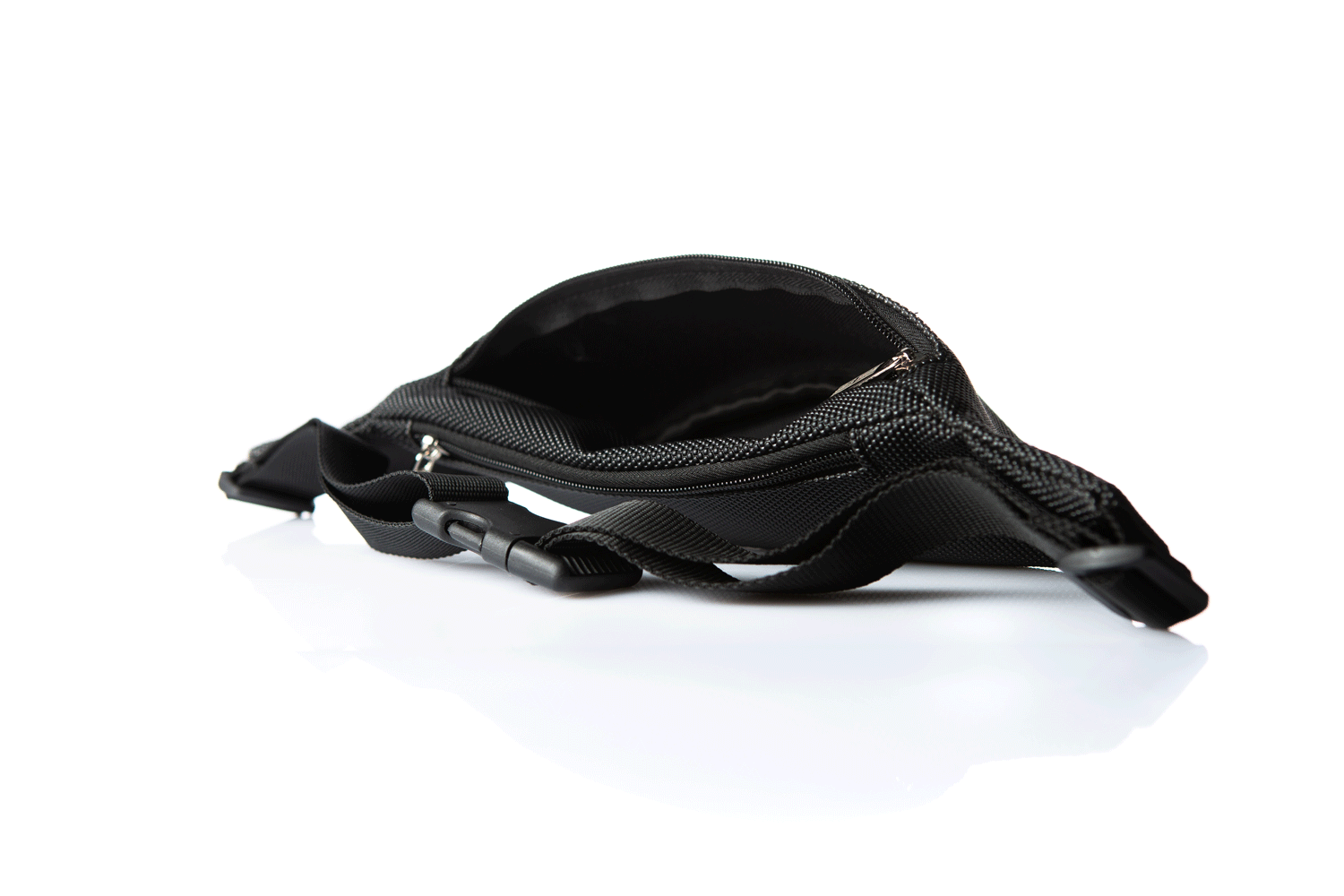 Bum Bag, een niervormig tasje gemaakt van zwart waterdicht materiaal. Door de verstelbare riem kan het op de heupen of in de taille worden gedragen. Het heeft twee compartimenten. Je stopt er gemakkelijk een telefoon, sleutels, portemonnee of documenten in.