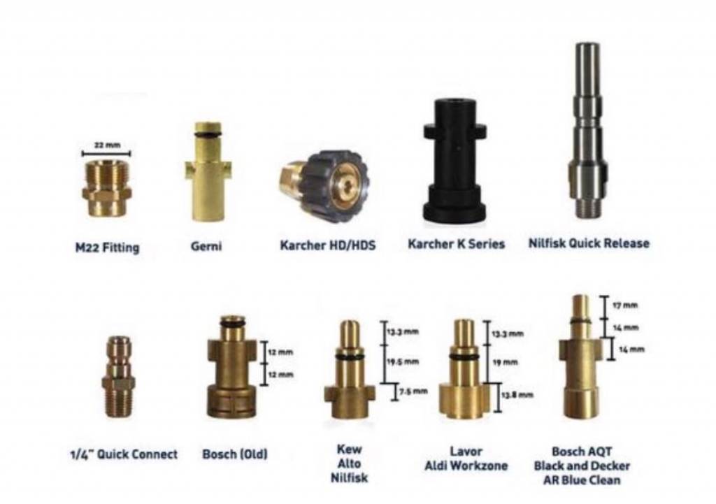 Alle populaire koppelingen voor hogedrukreinigers, gebruikt in de EU.